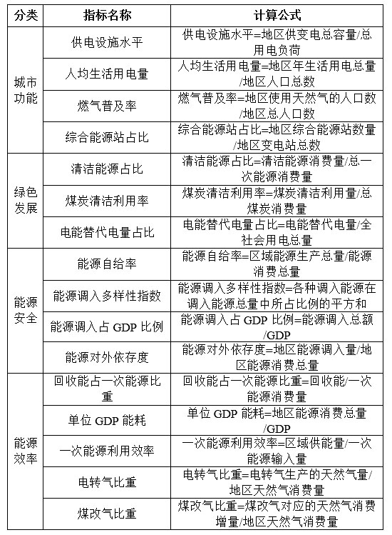 根據(jù)城市群綜合能源供應(yīng)系統(tǒng)對(duì)能源系統(tǒng)的影響機(jī)理分析,依據(jù)層次性、科學(xué)性、可度量的原則,分別從基礎(chǔ)功能、清潔發(fā)展、能源安全、能源效率四個(gè)方面構(gòu)建評(píng)價(jià)指標(biāo),如表所示。同時(shí),考慮到不同維度指標(biāo)特性,提供了每個(gè)指標(biāo)的具體計(jì)算方法和變量說(shuō)明。