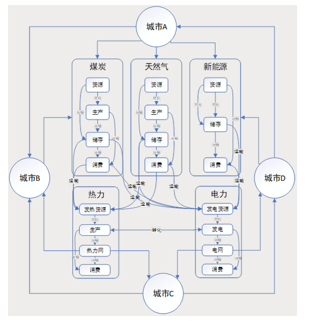 城市群綜合能源供應(yīng)系統(tǒng)功能的發(fā)揮,是所有構(gòu)成子系統(tǒng)及其要素共同作用的結(jié)果,子系統(tǒng)和要素之間必然存在著不同程度的聯(lián)系。因此,用來(lái)描述各子系統(tǒng)發(fā)展水平的一些指標(biāo),可能不僅僅描述某個(gè)子系統(tǒng)的某些狀態(tài),而是可以用來(lái)描述多個(gè)子系統(tǒng)的發(fā)展?fàn)顟B(tài)的。