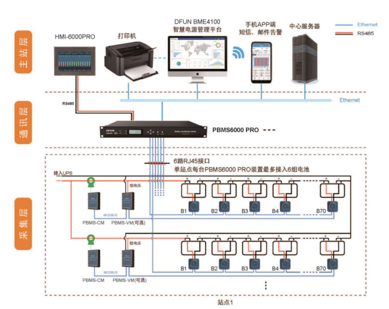 基于總線供電的全分布式在線電池監(jiān)測系統(tǒng),通過蓄電池本地監(jiān)測裝置,能遠(yuǎn)程實(shí)時(shí)對軌道沿線各個(gè)站點(diǎn)進(jìn)行運(yùn)行要求的數(shù)據(jù)采集,采集電池組電壓、電池組電流、電池組電壓均衡度、電池單體電壓、電池單體內(nèi)阻、電池單體溫度、電池單體SOC、電池單體SOH等。通過軌道交通專用數(shù)據(jù)網(wǎng)或數(shù)據(jù)傳輸網(wǎng),將數(shù)據(jù)傳送至控制中心服務(wù)器。完全可以替代人工巡檢繁瑣的日程工作,把日常維護(hù)巡檢中的危險(xiǎn)性和故障性降到最低,進(jìn)而降低運(yùn)維成本,真正做到各個(gè)站點(diǎn)機(jī)房無人值守。