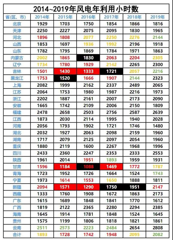 小編翻閱了國(guó)家能源局這些年的風(fēng)電運(yùn)行數(shù)據(jù),進(jìn)行了整理、制表,供大家更好的了解各省市自治區(qū)6年間的風(fēng)電運(yùn)行小時(shí)數(shù)。