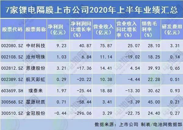 7家隔膜上市公司2020年上半年業(yè)績匯總