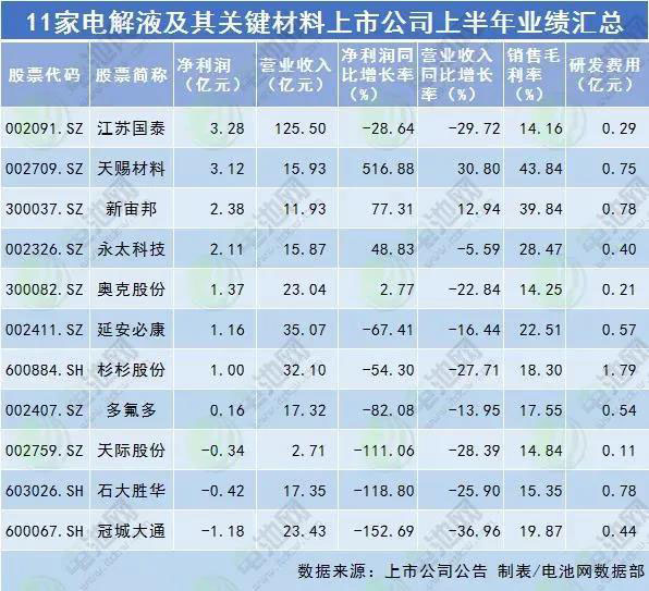 11家電解液上市公司2020年上半年業(yè)績匯總