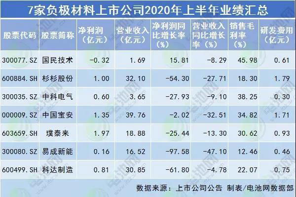 7家負(fù)極材料上市公司2020年上半年業(yè)績匯總