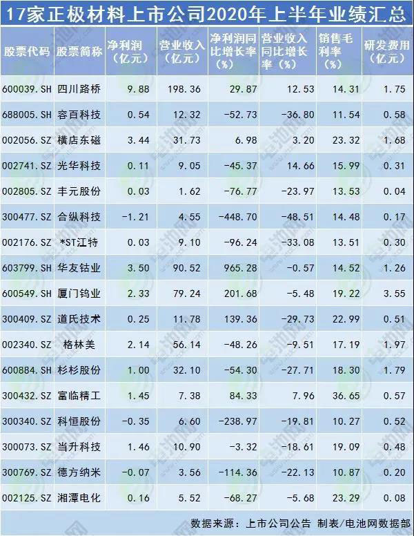 17家正極材料上市公司2020年上半年業(yè)績匯總
