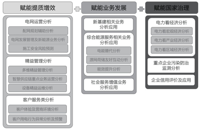 為了更好地發(fā)揮數(shù)據(jù)要素的作用,大數(shù)據(jù)應用必須向系統(tǒng)化、專業(yè)化、規(guī)?;较虬l(fā)展,從能源電力企業(yè)內(nèi)外部環(huán)境與市場需求來看,圍繞大數(shù)據(jù)應用在存量優(yōu)化、增量創(chuàng)新、公益服務三個領域的作用發(fā)揮,大數(shù)據(jù)應用的業(yè)務規(guī)劃將聚焦在“賦能提質增效”“賦能業(yè)務發(fā)展”“賦能國家治理”三大核心領域?;谀茉措娏?shù)據(jù)價值密度高、實時準確性強、覆蓋范圍廣等特點,重點開展“3+3+3”的典型企業(yè)級大數(shù)據(jù)應用。