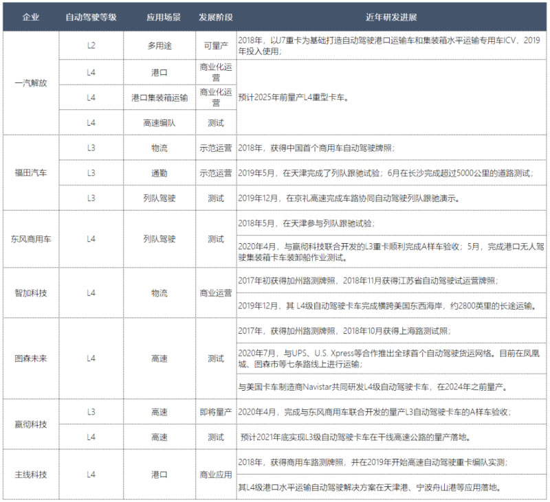 圖1 | 國內(nèi)部分企業(yè)自動駕駛卡車布局及進展(節(jié)選自百人會智能網(wǎng)聯(lián)研究院研報,點擊圖片獲取大圖)