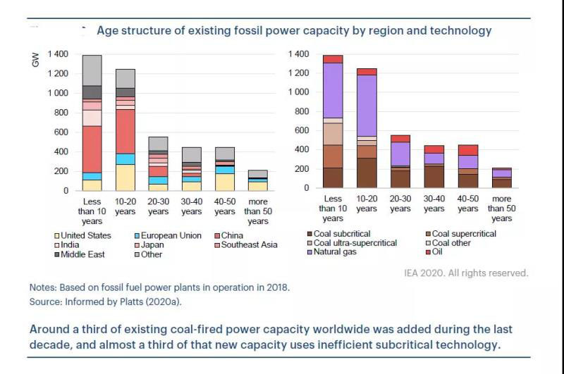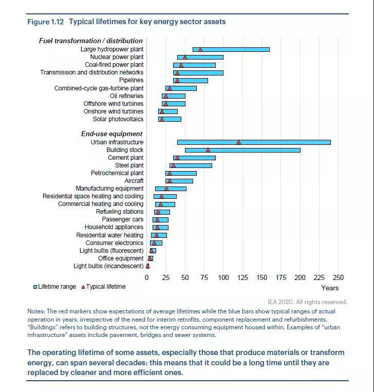 現(xiàn)有能源設(shè)施的在未來的碳排放與其壽命相關(guān)。以發(fā)電領(lǐng)域?yàn)槔诿绹?,現(xiàn)有煤電廠平均年齡超過40年,歐洲約35年,而大多數(shù)亞洲國家低于20年,在中國才13年。中國大約50%的現(xiàn)有火電在過去10年內(nèi)投運(yùn),85%的容量在過去的20年里投運(yùn)。在目前全球2100吉瓦的現(xiàn)有燃煤發(fā)電裝機(jī)容量(外加167吉瓦在建容量)中,到2050年仍有1440吉瓦繼續(xù)運(yùn)行,其中900吉瓦在中國。相比之下,燃?xì)獍l(fā)電廠壽命較短?,F(xiàn)有的全球1800吉瓦燃?xì)獍l(fā)電裝機(jī)中(外加在建的110吉瓦),到2050年只有350吉瓦仍在繼續(xù)運(yùn)行。
