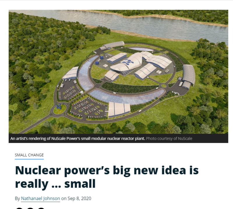 Grist.org網(wǎng)站發(fā)表署名Nathanael Johnson的文章,題目是:Nuclear power’s big new idea is really … small(核能的新思路真的…很?。?。