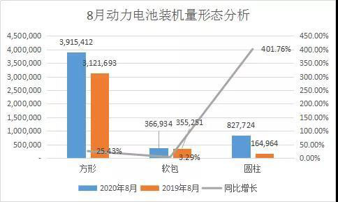 從電池形態(tài)來看,8月方形電池裝機(jī)量約3.92GWh,同比增長25.43%,環(huán)比增長3.4%,占總體的76.7%;軟包電池裝機(jī)量為0.37GWh,較去年同期微增3.29%,環(huán)比增長15.6%。