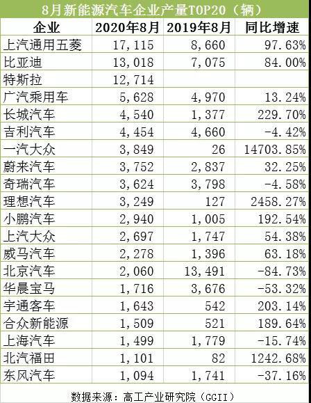 上汽通用五菱繼7月以破萬產(chǎn)量緊隨特斯拉后,8月延續(xù)兇猛勢頭,其產(chǎn)量達(dá)到1.71萬輛, 成功逆襲特斯拉,位列8月新能源汽車產(chǎn)量第一。