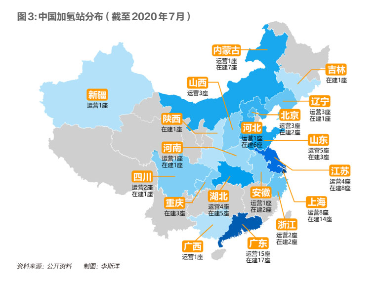 目前,中國(guó)已有6000多輛氫燃料電池商用車在運(yùn)行,主要是大巴和各種特種車。加氫站數(shù)量在2016年以后快速增加。截至今年7月,中國(guó)累計(jì)建成加氫站76座,投入運(yùn)營(yíng)的有52座。其中廣東省擁有量最大,有15座運(yùn)營(yíng),17座在建。