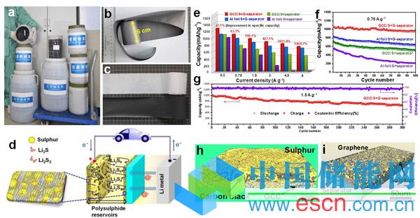 圖1 a:大量制備的石墨烯原料;b:連續(xù)石墨烯集流體;c:涂覆有石墨烯的連續(xù)隔膜;d:三明治鋰硫正極結(jié)構(gòu)的示意圖;不同電池構(gòu)造的鋰硫電池的e:倍率性能;f-g:循環(huán)穩(wěn)定性;h-i:三維X射線成像分析硫在硫正極及石墨烯復(fù)合隔膜中的分布
