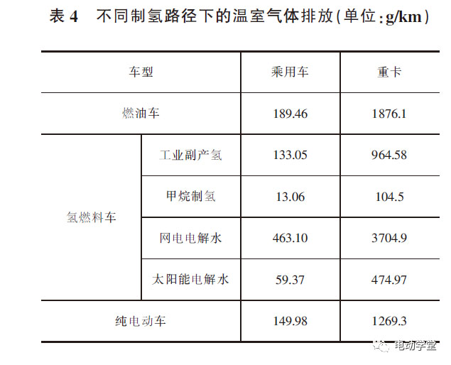 由表可知,就溫室氣體排放而言,不同制氫路徑下,氫燃料電池乘用車與汽油車相比,甲烷制氫可減排93.10%、工業(yè)副產(chǎn)氫可減排30%、網(wǎng)電電解水制氫增加130%的排放;與純電動(dòng)車相比,工業(yè)副產(chǎn)制氫可減排11%、甲烷制氫可減排91.29%、太陽能電解水制氫可減排60.41%、網(wǎng)電電解水制氫無溫室氣體減排優(yōu)勢(shì)。