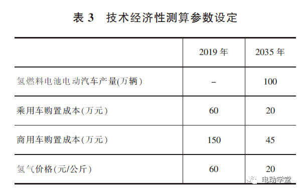 為準(zhǔn)確模擬,本文乘用車選取典型的B級(jí)汽油車、續(xù)駛里程300公里的純電動(dòng)汽車和功率為114千瓦的燃料電池電動(dòng)汽車作為研究車型;商用車選取同級(jí)別的柴油重卡、純電動(dòng)重卡和燃料電池重卡開展對(duì)比分析。燃料電池電動(dòng)汽車產(chǎn)量、燃料電池系統(tǒng)成本、氫氣價(jià)格等關(guān)鍵參數(shù)如表3所示,使用壽命乘用車按15年20萬里、長(zhǎng)途重卡按8年60萬公里計(jì)算。