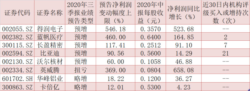 今年三季報(bào)業(yè)績(jī)預(yù)告方面,截至目前,有21家相關(guān)上市公司率先披露了2020年三季報(bào)業(yè)績(jī)預(yù)告,得潤(rùn)電子、藍(lán)帆醫(yī)療、長(zhǎng)盈精密、比亞迪、沃爾核材、英威騰、華峰鋁業(yè)、卡倍億等8家公司2020年前三季度凈利潤(rùn)均有望同比增長(zhǎng)。