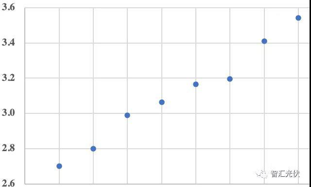8個(gè)項(xiàng)目的EPC第一候選人報(bào)價(jià)分布在2.7~3.54元/W,加權(quán)平均價(jià)格為3.1元/W;