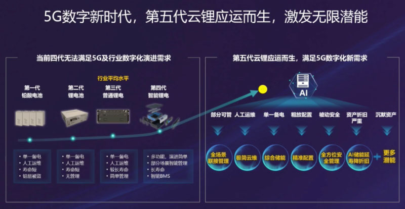 眾所周知,儲能經(jīng)歷了第一代鉛酸電池、第二代鋰電池、第三代普通鋰電和第四代智能鋰電,如今全球已進入全面鋰電時代,但是,當前第四代鋰電存在單一備電、人工運維、粗放配置、被動安全等問題,已無法滿足5G及行業(yè)數(shù)字化演進需求,而華為第五代云鋰CloudLi基于本地BMS+云BMS,并引入AI、大數(shù)據(jù)和IoT等技術(shù),可實現(xiàn)全場景聯(lián)接管理、極簡云維、綜合儲能、精準配置、全方位安全管理和AI儲能延壽降折舊,從而可更好的滿足行業(yè)數(shù)字化轉(zhuǎn)型新需求。