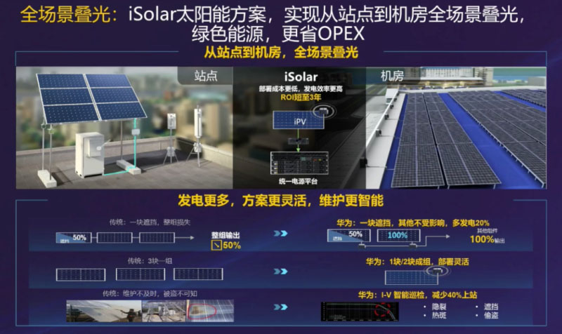 為了以供電方式、部署方式多樣化跨越能源鴻溝,打造低碳、高效的能源體系,華為推出了iSolar太陽能方案,可實現(xiàn)從站點到機房全場景疊光。相較于傳統(tǒng)方案,iSolar發(fā)電更多,方案更靈活,維護更智能,比如傳統(tǒng)方案下三塊太陽能組成一組,而iSolar一塊或兩塊就可成組,部署更靈活。