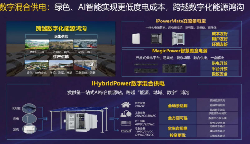 為跨越數(shù)字化能源鴻溝,降低用電成本,華為還推出了iPowerMate交流備電寶、MagicPower智慧魔盒電源和iHybridPower數(shù)字混合供電方案。iPowerMate就像一個行業(yè)充電寶,可經(jīng)濟、高效、便捷地應(yīng)用于移動備電供電場景;MagicPower以一個盒子提供交流、直流多種制式供電,可解決各種數(shù)字化場景中復(fù)雜的供電問題;iHybridPower是發(fā)供電一站式AI綜合能源站,支持太陽能、市電、油機等多種供電輸入,同時可面向民生設(shè)備、工業(yè)設(shè)備、ICT設(shè)備、專業(yè)設(shè)備等不同設(shè)備提供不同電壓的交直流供電輸出。