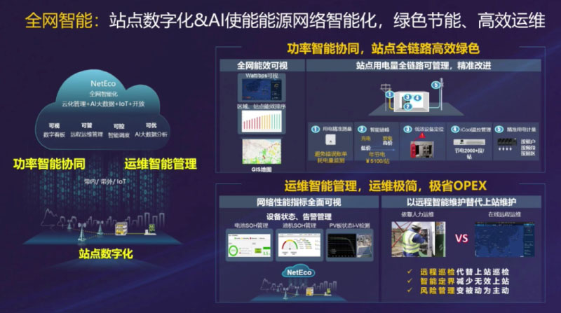 為了解決效率低、成本高的問題,華為提出了站點數(shù)字化和AI使能能源網(wǎng)絡(luò)全網(wǎng)智能化的解決方案,以實現(xiàn)綠色節(jié)能和高效運維。