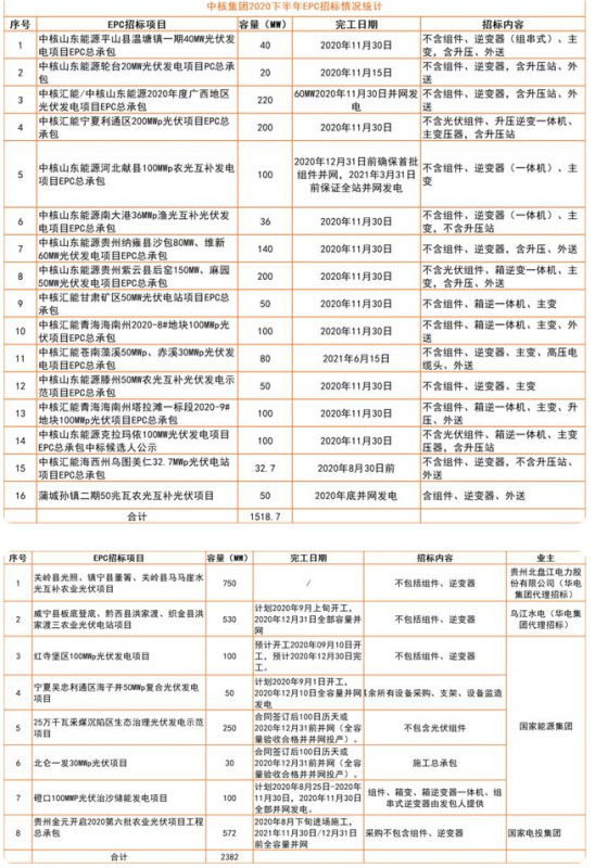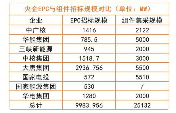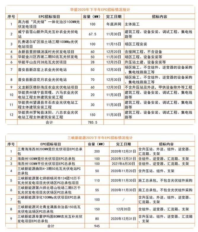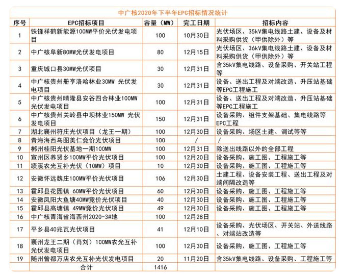 近日,光伏們從公開渠道跟蹤到7月至今大唐、中廣核、中核等8家央企共計(jì)10GW的EPC招標(biāo)詳情。根據(jù)招標(biāo)公告要求,共有8.5GW明確要求2020年底前并網(wǎng)或者具備并網(wǎng)條件。實(shí)際上,相比于組件集采容量,EPC招標(biāo)的規(guī)模更能反應(yīng)投資企業(yè)的具體項(xiàng)目落地情況。