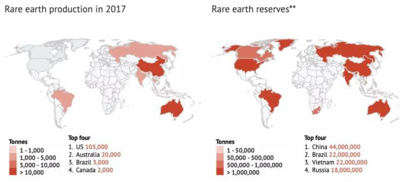 美國(guó)地質(zhì)勘探局的數(shù)據(jù)顯示,到目前為止,中國(guó)是稀土的主導(dǎo)力量,供應(yīng)年13萬(wàn)噸稀土的80%。中國(guó)擁有約44萬(wàn)噸稀土儲(chǔ)量,約為目前已知儲(chǔ)量的三分之一。在稀土元素的加工和供應(yīng)鏈中也占據(jù)主導(dǎo)地位,實(shí)現(xiàn)供應(yīng)多樣化可能需要幾十年的時(shí)間。
