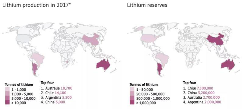 澳大利亞和智利是目前鋰的主要供應(yīng)國(guó)。鋰儲(chǔ)量比鈷略為廣泛,最大的是智利、中國(guó)和澳大利亞。智利、阿根廷和玻利維亞組成的所謂“鋰三角”擁有世界上鋰資源的一半。