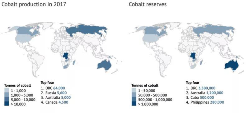 剛果民主共和國(guó)(DRC)主導(dǎo)著目前鈷的生產(chǎn),2017年提供了超過(guò)一半(58%)的總產(chǎn)量,并且擁有世界已知陸地儲(chǔ)量的一半。俄羅斯、澳大利亞和加拿大也生產(chǎn)鈷,盡管它們各自占世界供應(yīng)量的不到10%。