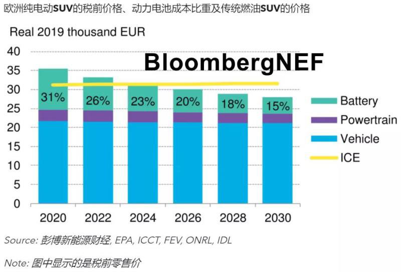 歐洲大型汽車市場(chǎng)和美國SUV市場(chǎng)等車型價(jià)格較高的汽車細(xì)分市場(chǎng)中,我們預(yù)計(jì)新能源汽車和燃油車最早于2022年實(shí)現(xiàn)平價(jià)。到2023年至2024年,動(dòng)力電池占整車成本中的比重預(yù)計(jì)降至20%或以下,電動(dòng)馬達(dá)約占整車成本的8%到10%,純電動(dòng)力總成汽車整車成本與燃油車相近。