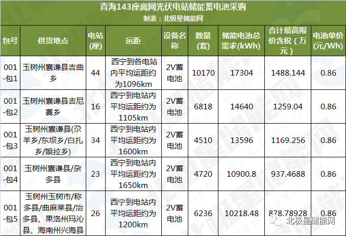 青海德坤電力有限公司發(fā)布143座離網(wǎng)光伏電站儲(chǔ)能蓄電池及19座離網(wǎng)光伏電站逆控設(shè)備物資招標(biāo)采購(gòu),其中標(biāo)包1~標(biāo)包5共143座光伏電站合計(jì)采購(gòu)儲(chǔ)能電池34254套、約66.66MWh,最高限價(jià)含稅5732.7萬(wàn)元,單價(jià)約0.86元/Wh。