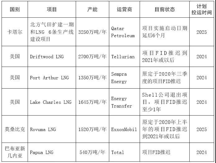 2020年3月,俄羅斯石油公司調(diào)整總產(chǎn)量超過400億立方米的Rospan和Kharampur天然氣項目的啟動期。其中Kharampur項目啟動日期被推遲到2021年,Rospan項目預(yù)計今年投入運營,但啟動日期已多次推遲。4月,殼牌表示將美國墨西哥灣南部Whale油氣田和英國北海Jackdaw天然氣田的FID推遲至2021年。同月,卡塔爾將北部天然氣出口項目擴(kuò)建工程開工時間推遲至2025年,該項目擴(kuò)建工程完成后LNG產(chǎn)能將達(dá)到1.1億噸/年。