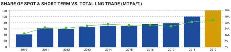 圖7 2010~2019年全球LNG現(xiàn)貨和短期貿(mào)易量及占比
