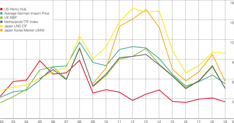 圖5 2002~2019年全球天然氣主要基準(zhǔn)價格(單位:美元/百萬英熱單位)
