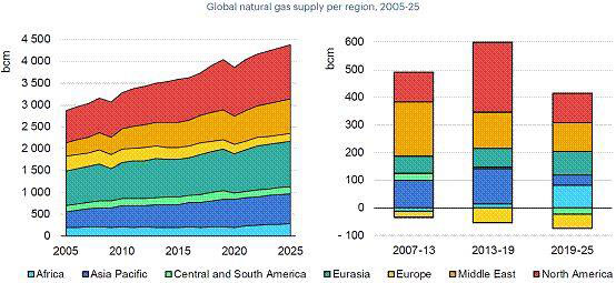 具體到各個地區(qū),IEA預(yù)測,到2025年,北美天然氣產(chǎn)量將以年均1.5%的速度增長,其中70%的產(chǎn)量增量源于美國的LNG出口。