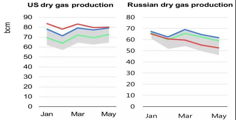 圖3 2020年1~5月美、俄天然氣產(chǎn)量變化情況