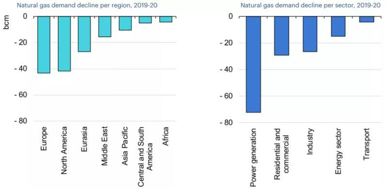 從地區(qū)來看,歐洲、北美、歐亞大陸和亞洲的成熟市場合計占2020年全球天然氣需求下降總量的75%。從部門來看,電力部門所受影響最為嚴(yán)重,占天然氣需求下降總量的一半,其次是住宅和商業(yè)部門,以及工業(yè)部門。