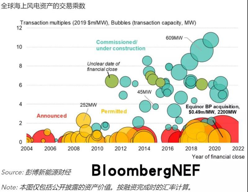 BP以11億美元收購了Equinor美國海上風電資產組合的50%股權,其中包括兩個海上風電租約:一個在麻省,另一個在紐約州。兩者面積合計842平方公里,BP聲稱兩個租賃區(qū)可以容納4.4GW的海上風電項目。兩個租賃區(qū)將按項目劃分,參與各州的海上風電競價。目前兩個租賃區(qū)尚無獲選容量,所以BP本次收購的資產尚處早期階段,收購交易乘數與以往處于類似階段的的其他資產組合收購是一致的。