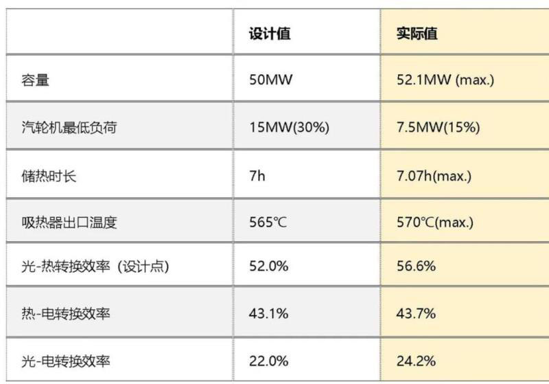 經(jīng)過一年多的實(shí)際運(yùn)行發(fā)現(xiàn),各項(xiàng)指標(biāo)實(shí)測數(shù)據(jù)優(yōu)于設(shè)計(jì)值。比如,聚光集熱系統(tǒng)滿負(fù)荷運(yùn)行時(shí),吸熱器出口熔鹽溫度達(dá)到565℃,最高為570℃,設(shè)計(jì)點(diǎn)光熱轉(zhuǎn)換效率達(dá)56.6%(設(shè)計(jì)值52.0%);設(shè)計(jì)點(diǎn)光電效率達(dá)到24.2%(設(shè)計(jì)值22.0%)。金建祥透露。
