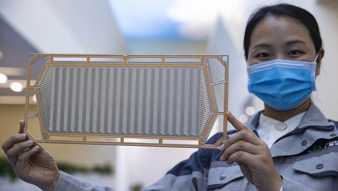 一塊極板的厚度僅為75微米左右,比紙還薄,要在板上沖壓出密密麻麻的流道,讓氫氣、氧氣和冷卻液在那里傳輸,其技術(shù)難度可想而知?!盀榻鉀Q一沖壓就裂的難題,我們做了10年基礎(chǔ)研究和工程驗證?!彼{(lán)樹槐說,經(jīng)過機械、流體力學(xué)、工程熱力學(xué)等多學(xué)科交叉攻關(guān),交大團隊通過微細(xì)成形過程仿真模型,梯度圓角設(shè)計、應(yīng)力積分回彈補償?shù)任⒓?xì)成形工藝設(shè)計,開發(fā)出不同于宏觀制造的介觀制造新工藝。檢測報告顯示,超薄金屬雙極板制造工藝的誤差控制在10微米以內(nèi)。