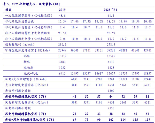 “十四五”非化石能源消費(fèi)目標(biāo)有望超預(yù)期,新能源裝機(jī)或再上一個(gè)臺(tái)階。由于新能 源行業(yè)降本速度迅速,且 2019 年國(guó)內(nèi)非化石能源消費(fèi)目標(biāo)已經(jīng)提前完成,我們預(yù)測(cè) 2025 年非化石能源消費(fèi)目標(biāo)有望超預(yù)期,非化石能源占一次能源消費(fèi)比重或超過 15%,達(dá)到 17.0%-20.0%的水平,對(duì)應(yīng)國(guó)內(nèi)光伏年均新增裝機(jī)空間為 42-86 GW,風(fēng)電年均新增裝機(jī)空 間為 25-51GW,合計(jì)年均新增裝機(jī)空間為 67-137 GW。