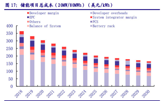 儲(chǔ)能成本持續(xù)降低,項(xiàng)目差異性較大。儲(chǔ)能項(xiàng)目成本差異較大,主要受功率能量比、 項(xiàng)目規(guī)模、項(xiàng)目復(fù)雜程度、冗余度及當(dāng)?shù)胤ㄒ?guī)等的影響。根據(jù) BNEF 最新完成的全球儲(chǔ)能 系統(tǒng)成本調(diào)研,2019 年一個(gè)完成安裝的、4 小時(shí)電站級(jí)儲(chǔ)能系統(tǒng)的成本范圍為 300-446 美 元/kWh,處在一個(gè)持續(xù)下降的階段。根據(jù) BNEF 預(yù)測(cè),2025 年儲(chǔ)能項(xiàng)目總成本有望降至 203 美元/kWh,2030 年儲(chǔ)能項(xiàng)目總成本有望降至 165 美元/kWh,相對(duì)于 2019 年分別降幅為 38.7%、50.2%。