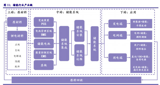 儲(chǔ)能可應(yīng)用于發(fā)電端、電網(wǎng)端和用電端。儲(chǔ)能產(chǎn)業(yè)鏈的上游為原材料供應(yīng)商,負(fù)責(zé)原 材料和鋰電材料的生產(chǎn)與供應(yīng);中游為電化學(xué)儲(chǔ)能系統(tǒng),以電池(PACK)為核心,包括電 芯、BMS、EMS、PCS 等多個(gè)部分,是一個(gè)綜合能源控制系統(tǒng),一般采用集裝箱布置,并進(jìn) 行安裝、運(yùn)維和原料回收;下游應(yīng)用于發(fā)電端、電網(wǎng)端和用戶端。