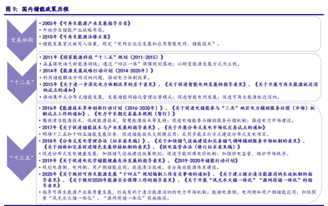 我國(guó)國(guó)家層面政策推動(dòng)儲(chǔ)能技術(shù)從研發(fā)示范向大規(guī)模應(yīng)用發(fā)展轉(zhuǎn)變。我國(guó)在儲(chǔ)能產(chǎn)業(yè) 的戰(zhàn)略布局開始于 2005 年出臺(tái)的《可再生能源發(fā)展指導(dǎo)目錄》。2010 年,儲(chǔ)能行業(yè)發(fā)展 首次被寫進(jìn)法案,《可再生能源法修正案》第十四條中規(guī)定“電網(wǎng)企業(yè)應(yīng)發(fā)展和應(yīng)用智能 電網(wǎng)、儲(chǔ)能技術(shù)”,在此法案指引下各地開始制定儲(chǔ)能相關(guān)政策。2011 年,儲(chǔ)能被寫入“十 二五”規(guī)劃綱要,《國(guó)家能源科技“十二五”規(guī)劃(2011-2015)》明確儲(chǔ)能研究方向。2014 年,《能源發(fā)展戰(zhàn)略行動(dòng)計(jì)劃(2014-2020 年)》首次提出利用儲(chǔ)能去解決可再生能源的 并網(wǎng)消納問題。2016 年,《能源技術(shù)革命創(chuàng)新行動(dòng)計(jì)劃(2016-2030 年)》成為電儲(chǔ)能技 術(shù)發(fā)展的重要指導(dǎo)文件。2017 年 10 月 11 日,我國(guó)大規(guī)模儲(chǔ)能技術(shù)及應(yīng)用發(fā)展的首個(gè)指導(dǎo) 性政策《關(guān)于促進(jìn)儲(chǔ)能產(chǎn)業(yè)與技術(shù)發(fā)展的指導(dǎo)意見》正式發(fā)布,明確“十三五”和“十四 五”時(shí)期儲(chǔ)能發(fā)展任務(wù)。2019 年 6 月,《2019-2020 年儲(chǔ)能行動(dòng)計(jì)劃》進(jìn)一步推進(jìn)“十三 五”期間儲(chǔ)能由研發(fā)示范向商業(yè)化初期過渡,同時(shí)為“十四五”期間儲(chǔ)能由商業(yè)化初期向 規(guī)?;l(fā)展轉(zhuǎn)變奠定基礎(chǔ)。