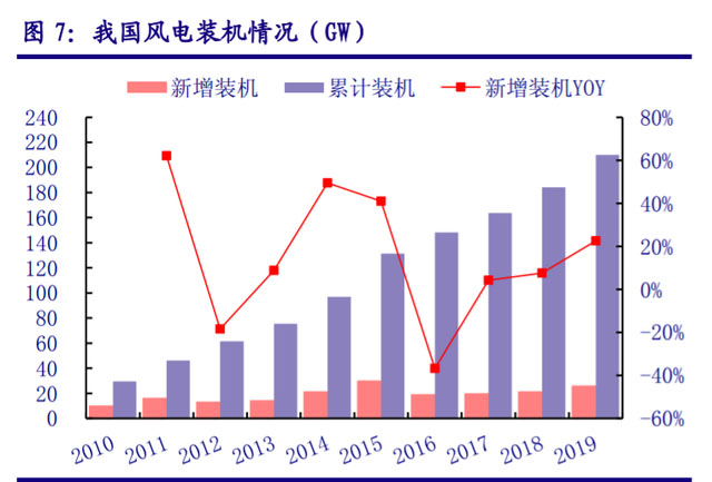 風(fēng)電:我國(guó)已經(jīng)成為全球最大風(fēng)電市場(chǎng),即將邁進(jìn)平價(jià)階段。根據(jù) GWEA,我國(guó)風(fēng)電累 計(jì)裝機(jī)容量占全球比重從 2000 年的 2.0%增長(zhǎng)至 2018 年的 35.4%。根據(jù)中電聯(lián),2019 年我 國(guó)風(fēng)電新增裝機(jī)達(dá)到 25.7GW(+22.6%),累計(jì)容量達(dá)到 210 GW,已經(jīng)成為全球最大風(fēng)電市 場(chǎng)。伴隨著行業(yè)的快速發(fā)展,風(fēng)電行業(yè)的補(bǔ)貼逐漸退坡,近年來國(guó)家多次下調(diào)風(fēng)電上網(wǎng)標(biāo) 桿電價(jià)。根據(jù)發(fā)改委規(guī)定,對(duì)于“2018 年底之前核準(zhǔn)、2020 年底前未完成并網(wǎng)”,“2019 年至 2020 年底前核準(zhǔn)的、2021 年底前未完成并網(wǎng)”的陸風(fēng)項(xiàng)目,國(guó)家將不再補(bǔ)貼;2021 年 1 月 1 日起新核準(zhǔn)的陸風(fēng)項(xiàng)目全面實(shí)現(xiàn)平價(jià)上網(wǎng),行業(yè)即將邁進(jìn)平價(jià)階段。