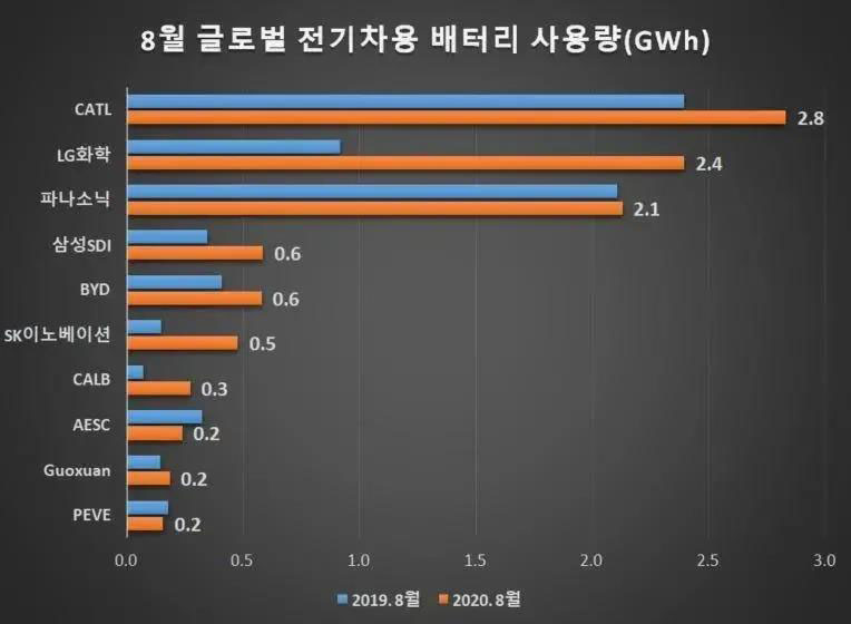不過,從今年1-8月的整體數(shù)據(jù)來看,LG化學(xué)還是以15.9GWh裝機量位居全球榜首,寧德時代則以15.5GWh,屈居第二,排在后面的分別是松下電池、三星SDI、SKI和比亞迪等電池生產(chǎn)企業(yè)。
