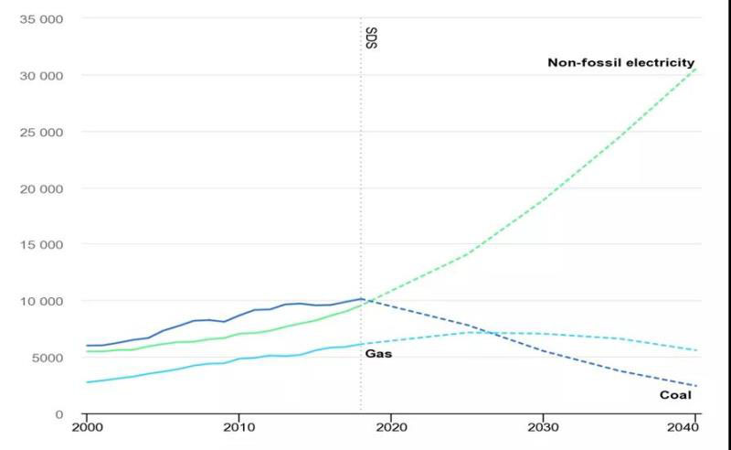 圖4 IEA SDS情景下全球天然氣發(fā)電量變化趨勢(單位:太瓦時)