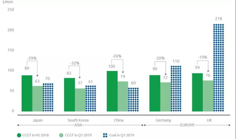 制約天然氣發(fā)電產業(yè)發(fā)展的首要因素是發(fā)電燃料成本高,影響到天然氣發(fā)電的優(yōu)勢。近年來,天然氣價格的下降趨勢使之與燃煤發(fā)電相比逐步具備了競爭力,這對亞洲的氣電發(fā)展至關重要,因為亞洲傳統(tǒng)上是全球天然氣價格最高的地區(qū),且該地區(qū)的煤炭價格最低。2019年第一季度,日本和韓國天然氣發(fā)電的平準化度電成本(LCOE)已低于燃煤發(fā)電。在中國,天然氣發(fā)電的LCOE仍高于燃煤發(fā)電,但兩者之間的差距縮?。ㄒ妶D3)。