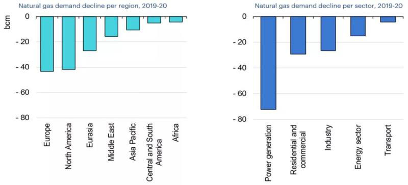 受新冠肺炎疫情全球蔓延影響,截至2020年6月初,全球主要天然氣市場都出現(xiàn)了不同程度的需求下降或增長放緩。IEA在其6月發(fā)布的《2020年天然氣報告》中指出,整個2020年,全球各個部門天然氣消費量都將下降,且發(fā)電部門所受影響最為嚴重(見圖2)。因疫情原因實施的地區(qū)封鎖措施導致用電量減少,已經對天然氣發(fā)電造成嚴重沖擊。受電力需求下降和可再生能源發(fā)電增長的雙重影響,天然氣發(fā)電在歐洲受到的沖擊尤其嚴重。在除中東以外的新興市場,天然氣發(fā)電在電力結構中占比較低,受到的影響相對較小。IEA的最新預測顯示,2020年全球發(fā)電用天然氣需求將同比下降約7%,占全球天然氣需求下降的60%左右。