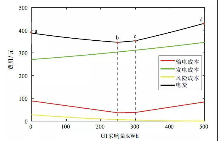 在霍特林模型下綜合考慮發(fā)電成本、風(fēng)險(xiǎn)成本和輸電成本,交易方案產(chǎn)生的實(shí)際電費(fèi)如圖4所示。隨著用戶在G1處所購電量增加,風(fēng)險(xiǎn)成本逐步降低,總電費(fèi)呈現(xiàn)先降低后升高的趨勢(shì)。相較于發(fā)電成本,輸電成本占比小,且不僅取決于交易雙方,也受實(shí)際電網(wǎng)線路的制約,仿真難度相對(duì)較大,所以在電力交易中經(jīng)常被簡(jiǎn)化忽略。但若只考慮發(fā)電成本,會(huì)從G2購買全部電力,雖然發(fā)電成本最低僅271元,但電能傳輸引起的輸電成本較高,增加了總費(fèi)用。相比之下,雖然方案b的發(fā)電成本略高為305元,但其極大節(jié)約了輸電成本,最終降低了總費(fèi)用至347元。因此,電力交易中對(duì)輸電成本的考量很有必要。