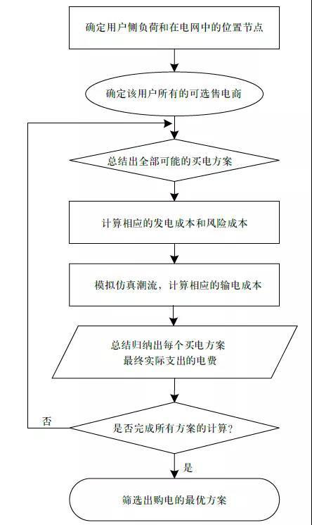 在交易開始前,先確定用戶的負(fù)荷需求及其在電網(wǎng)中的具體位置,根據(jù)位置確定潛在可選擇的發(fā)電商,推導(dǎo)出可能的交易策略。為了篩選出經(jīng)濟(jì)最佳方案,需要分別模擬每種策略的發(fā)電成本、風(fēng)險(xiǎn)成本和輸電成本。發(fā)電成本通過綜合所選發(fā)電商的發(fā)電成本和相應(yīng)采購量計(jì)算。風(fēng)險(xiǎn)成本需要確定所選發(fā)電商是否存在可再生能源,并根據(jù)其相應(yīng)的采購量計(jì)算。輸電成本需先仿真電路潮流,在相應(yīng)線路潮流的基礎(chǔ)上綜合整合而得。